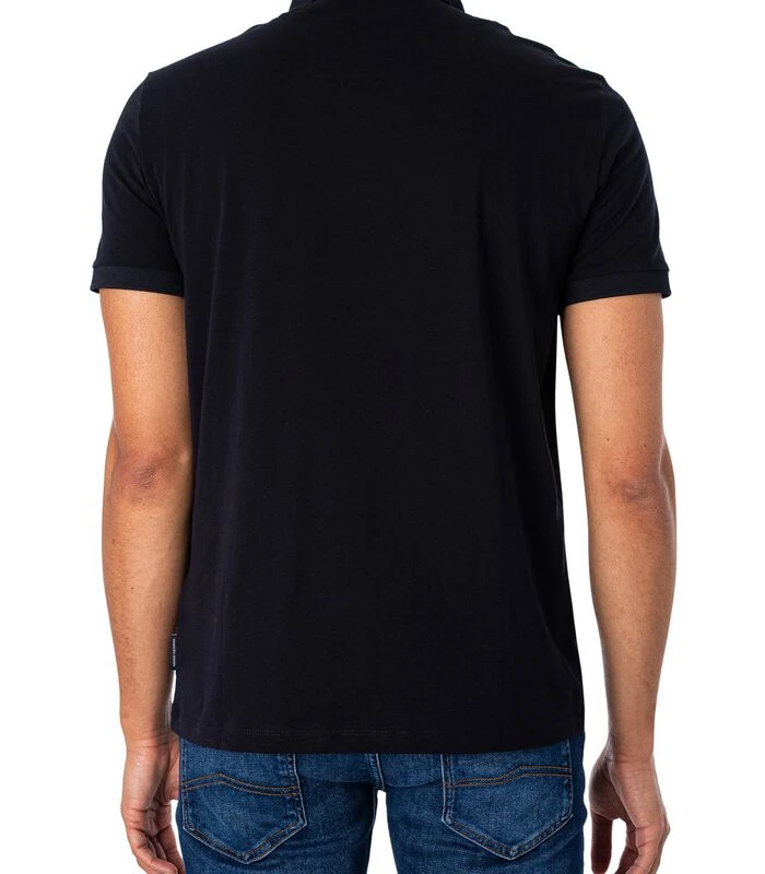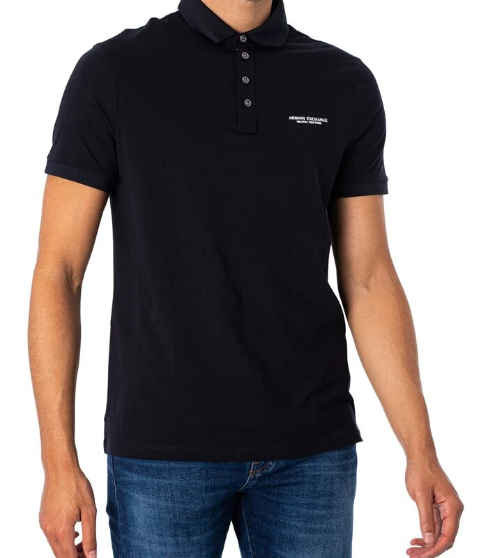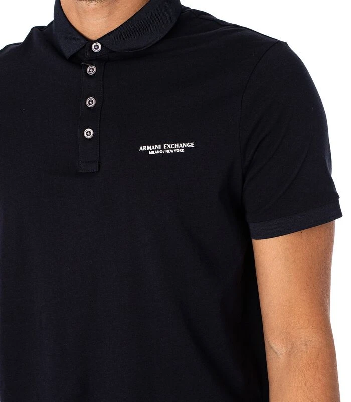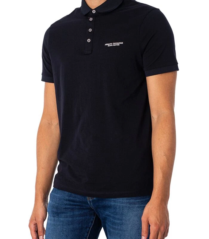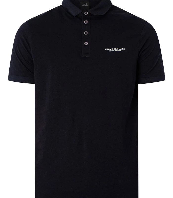 Het Chest Logo Polo Shirt van Armani Exchange wordt geleverd met korte elastische mouwen en een rechte zoom, met een sluiting met drie knopen en merkknopen. Deze polo is uitgevoerd in de kleur Navy en heeft een geborduurd logo op de borst.