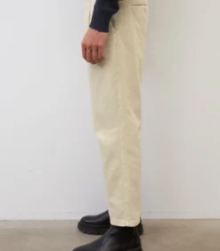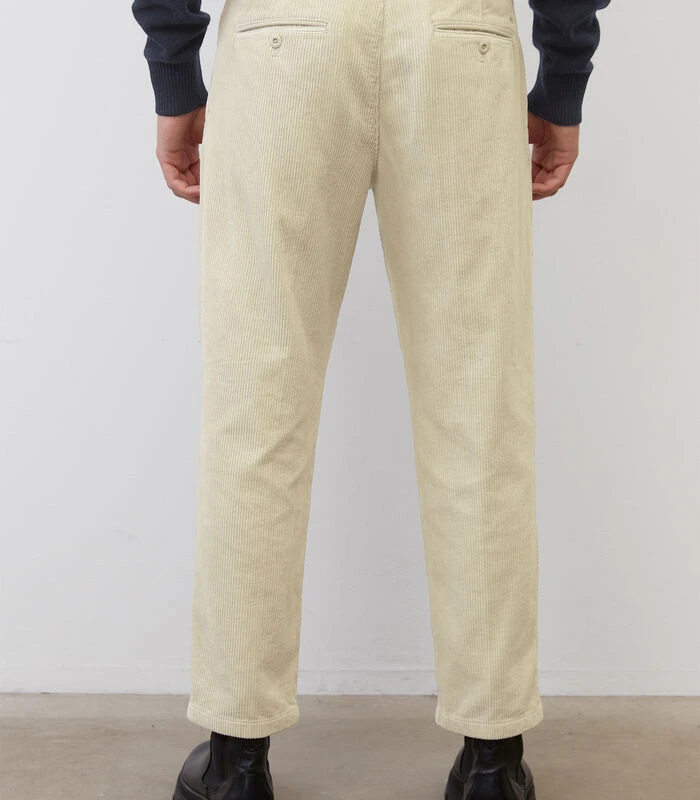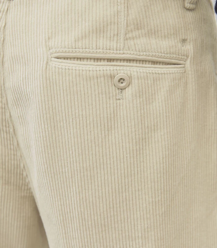 Van zacht, breed geribd corduroy: casual broek – model BELSBO pleats – met een casual relaxed fit met taps toelopende pijpen. De broek is gemaakt van duurzaam biologisch katoen met een klassieke afwerking van de band met bandplooidetails, knoop en rits en steekzakken aan de zijkant. Daarnaast heeft de broek paspelzakken met knopen aan de achterkant. Na de productie wordt de broek per stuk geverfd. Daardoor ontstaat er een bijzonder mooie kleur.