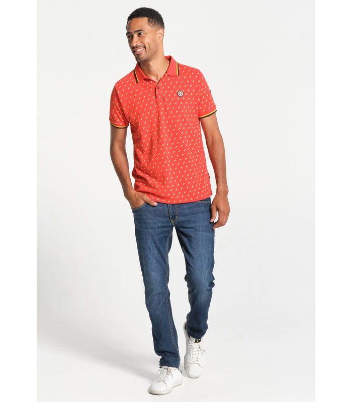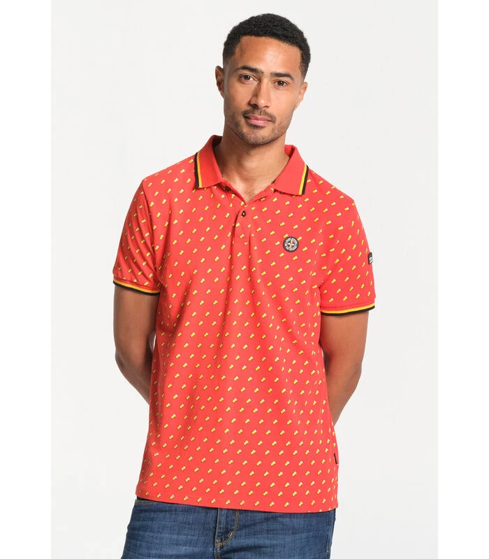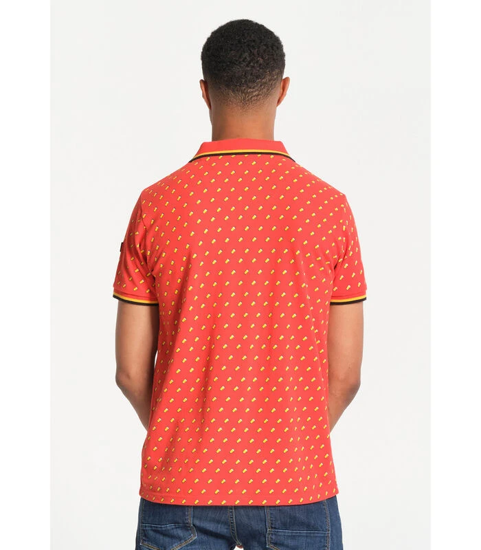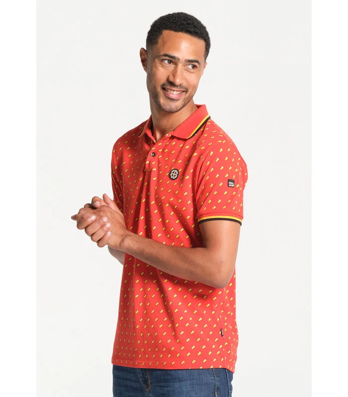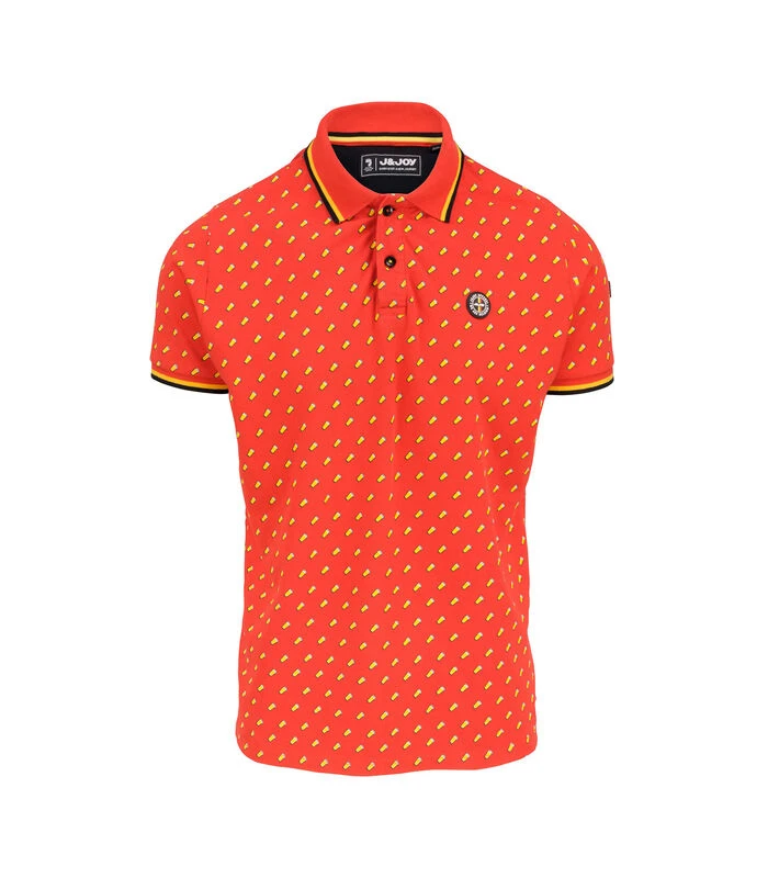 Een mooi rood poloshirt kort –Sleeves die u zullen vergezellen tijdens en na de wedstrijden. De snit is recht. De kraag en de bodem van de mouwen zijn geribbeld en hebben een zwarte, gele, rode rand. Met deze kleine feestelijke bieren prints, dat is zeker, we zullen altijd weten waar je bent …