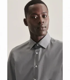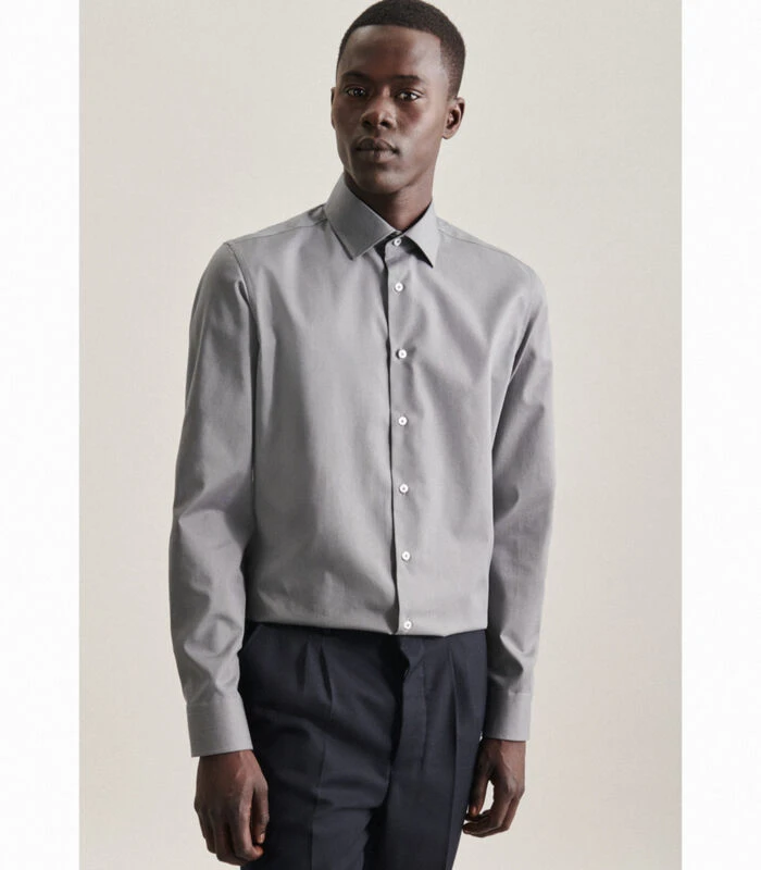 Strakke moderniteit met formele en informele details kenmerkt de shirts van Seidensticker. Dit uitgangspunt geldt voor de hele herencollectie van Seidensticker en is merkbaar in alle stijlen, kwaliteiten en pasvormen. De man laat dit zien in zijn ontspannen houding en zijn eigentijdse omgang met mode en stijl. De maat Shaped is een getailleerde pasvorm voor slanke mannen. Twee plooien in de rug onderstrepen de nauwsluitende fit.