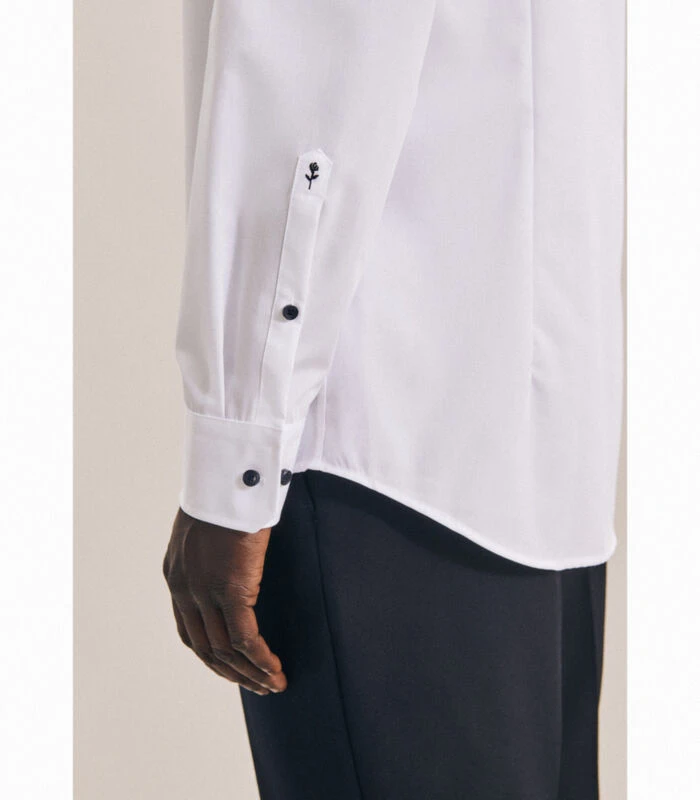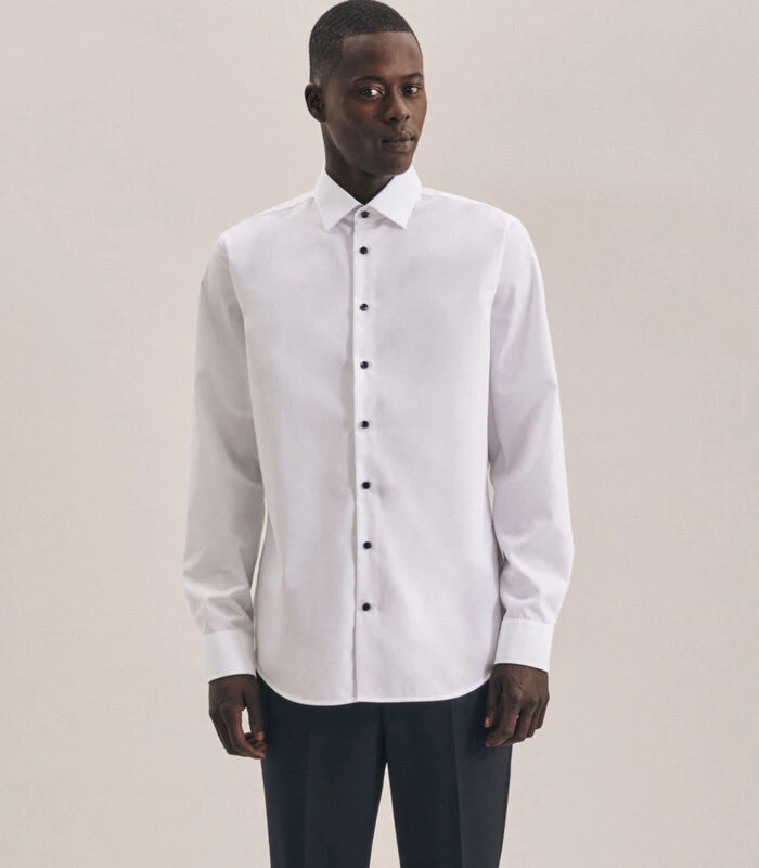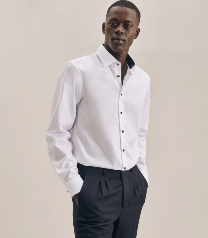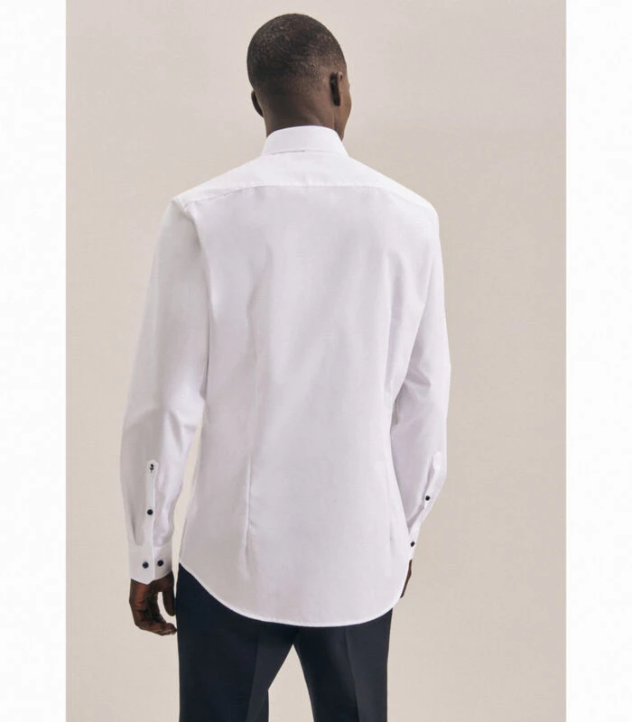 Strakke moderniteit met formele en informele details kenmerkt de shirts van Seidensticker. Dit uitgangspunt geldt voor de hele herencollectie van Seidensticker en is merkbaar in alle stijlen, kwaliteiten en pasvormen. De man laat dit zien in zijn ontspannen houding en zijn eigentijdse omgang met mode en stijl. De maat Shaped is een getailleerde pasvorm voor slanke mannen. Twee plooien in de rug onderstrepen de nauwsluitende fit.