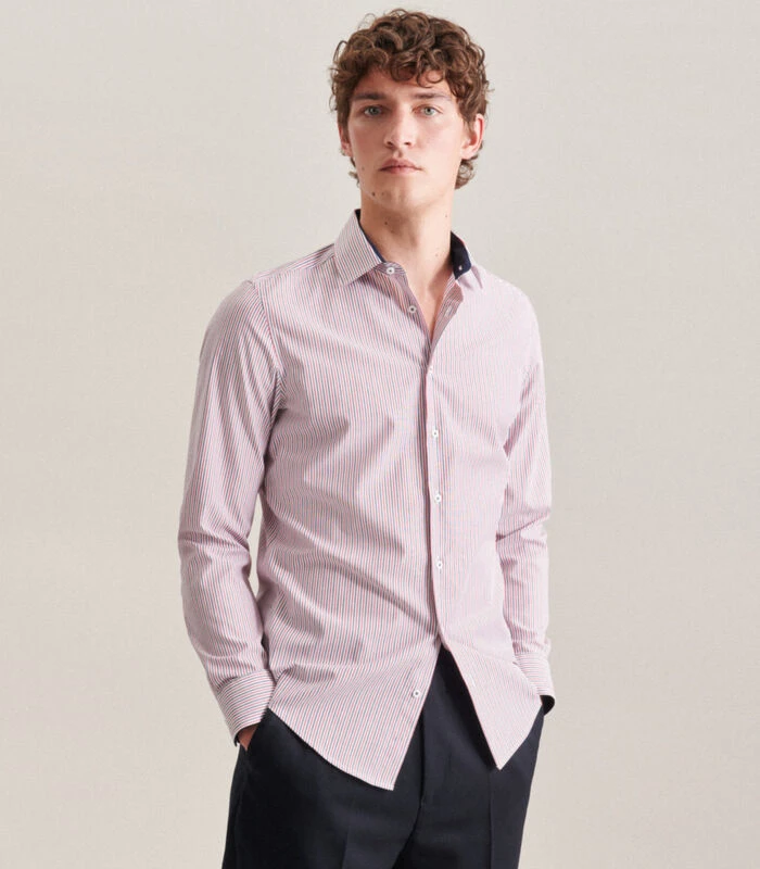Slimme moderniteit met formele en casual aspecten kenmerkt de shirts van Seidensticker. De basishouding doordringt de gehele Seidensticker Men collectie en is voelbaar in alle stijlen, kwaliteiten en pasvormen. De man weerspiegelt dit in zijn ontspannen houding en zijn eigentijdse benadering van mode en stijl. De slanke Slim fit pasvorm voor slanke mannen: twee pijltjes op de rug accentueren het figuur.