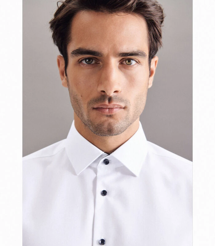 Slimme moderniteit met formele en casual aspecten kenmerkt de shirts van Seidensticker. De basishouding doordringt de gehele Seidensticker Men collectie en is voelbaar in alle stijlen, kwaliteiten en pasvormen. De man weerspiegelt dit in zijn ontspannen houding en zijn eigentijdse benadering van mode en stijl. De slanke Slim fit pasvorm voor slanke mannen: twee pijltjes op de rug accentueren het figuur.
